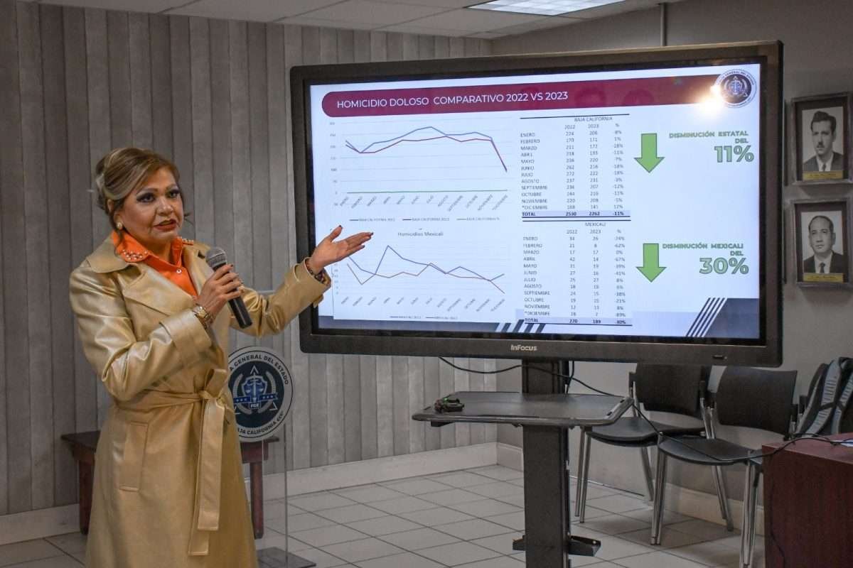 Mexicali, Baja California.- La Fiscal General Ma. Elena Andrade Ramírez presentó este día los avances logrados durante este 2023, en donde destacó que, como resultado del fortalecimiento al combate a los delitos implementado por la FGE, se han reducido los homicidios en Baja California, principalmente en la capital del Estado.