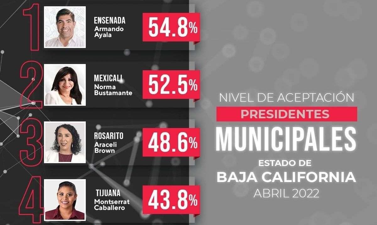 Del total de participantes, cerca de 650 evaluaron en forma favorable el desempeño de Armando Ayala; seguido, por la alcaldesa Norma Bustamante de Mexicali, con un 52.5 %; Araceli Brown de Playas de Rosarito con 48.6 %; Montserrat Caballero de Tijuana con 43.8 % y Darío Benítez de Tecate con 41.7 %.